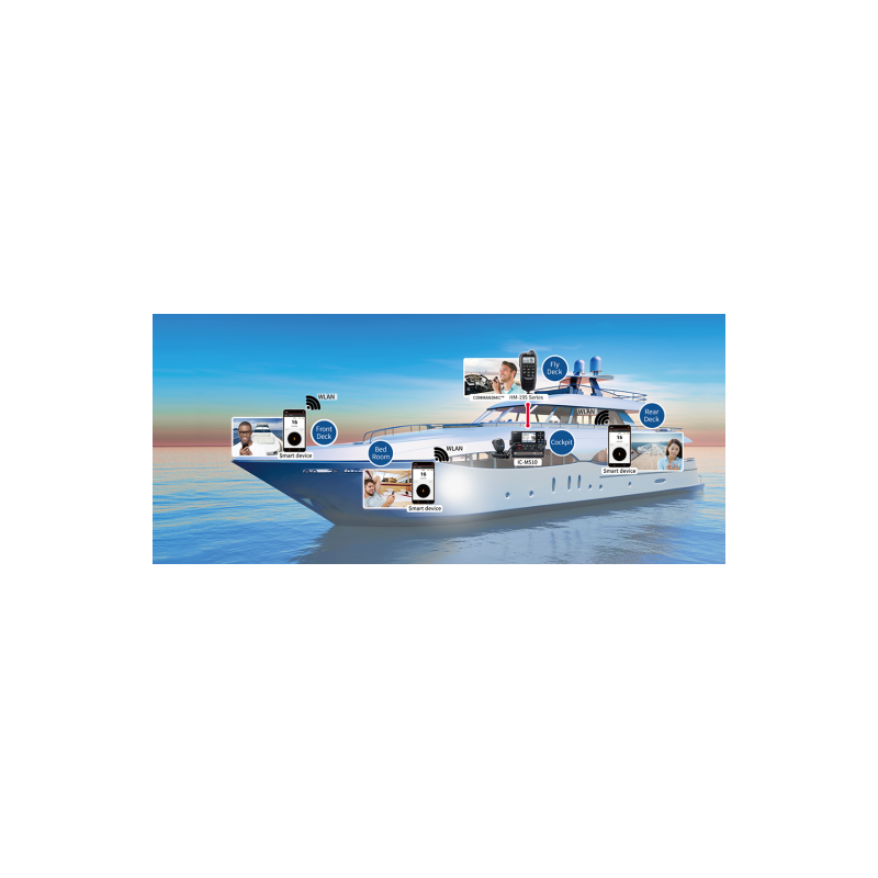 El IC-M510E es una elegante y nueva radio marina avanzada VHF/DSC de Icom que le da el control de la radio a través de su teléfono inteligente utilizando la aplicación RS-M500 (iOSTM/AndroidTM). De hecho, hasta tres teléfonos inteligentes pueden actuar como mandos a distancia a través de la red WLAN de la radio. Incluso es posible tener una función de intercomunicación entre su teléfono inteligente y la propia radio.